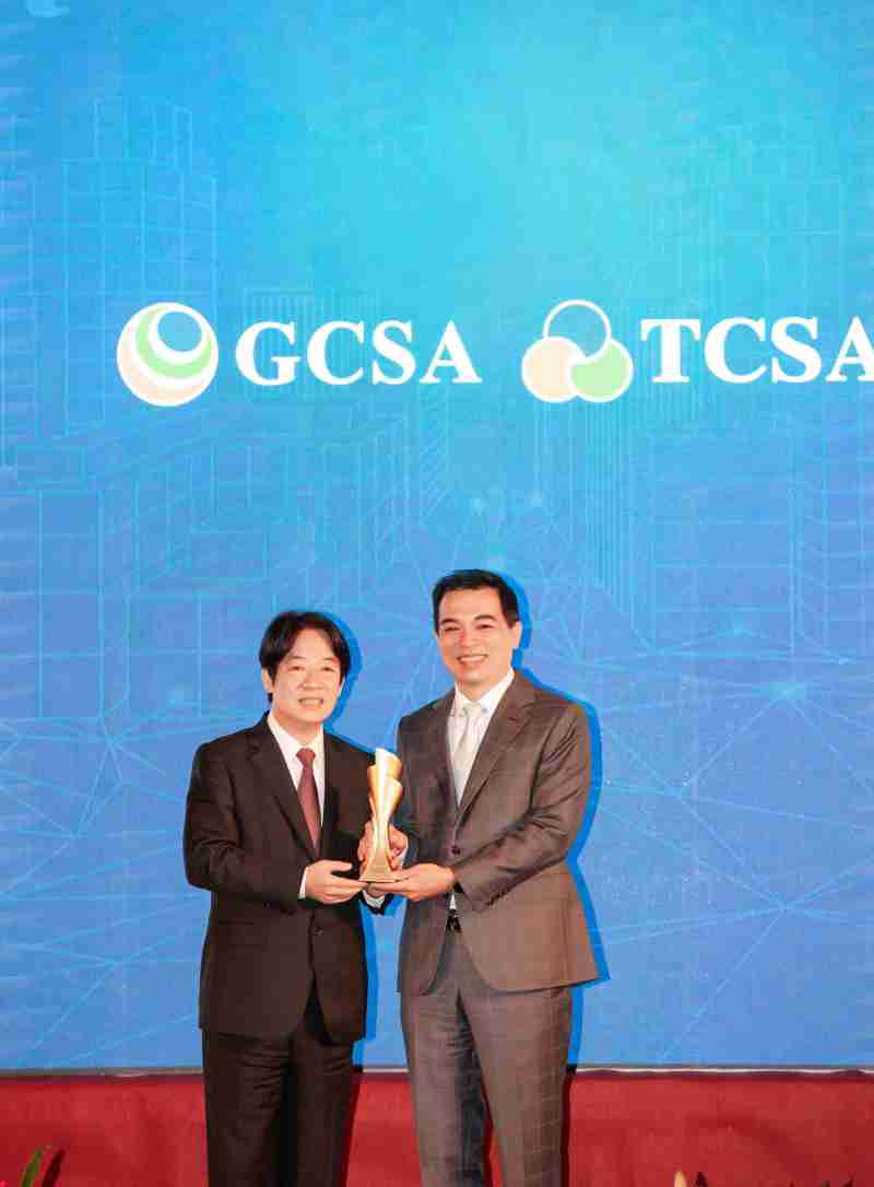 达全方位永续表现获全球永续奖及台湾永续奖肯定,,,,由副总统赖清德颁奖 (左),,万利总经理柯富仁 (右) 代表领奖