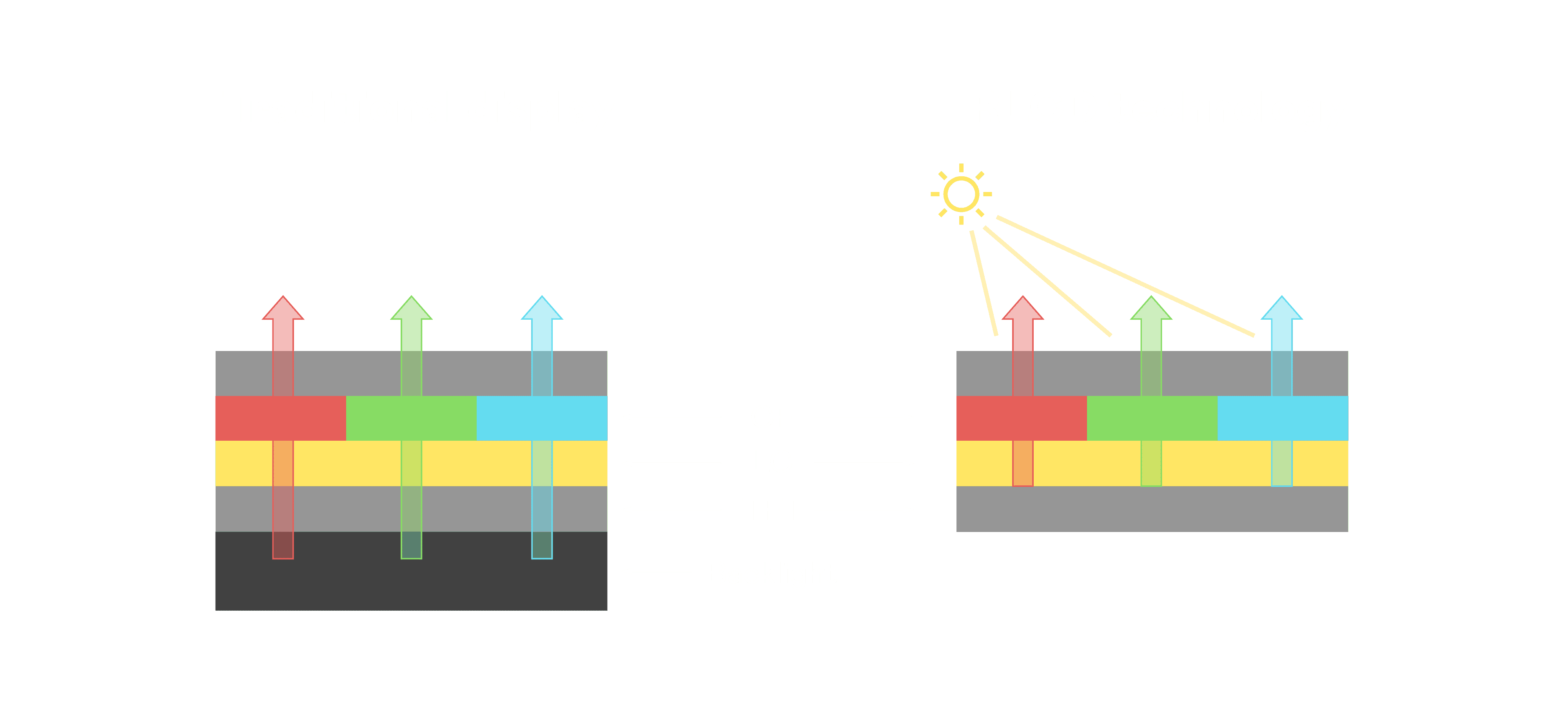 与传统需搭配背光单元的液晶显示相比,,,反射式液晶技术不仅更省电、、、、更轻薄,,且即便在艳阳下仍能清晰显示。。。此外,,,少了背光单元,,,也大幅降低了 LED 蓝光伤害眼睛的疑虑。。。。