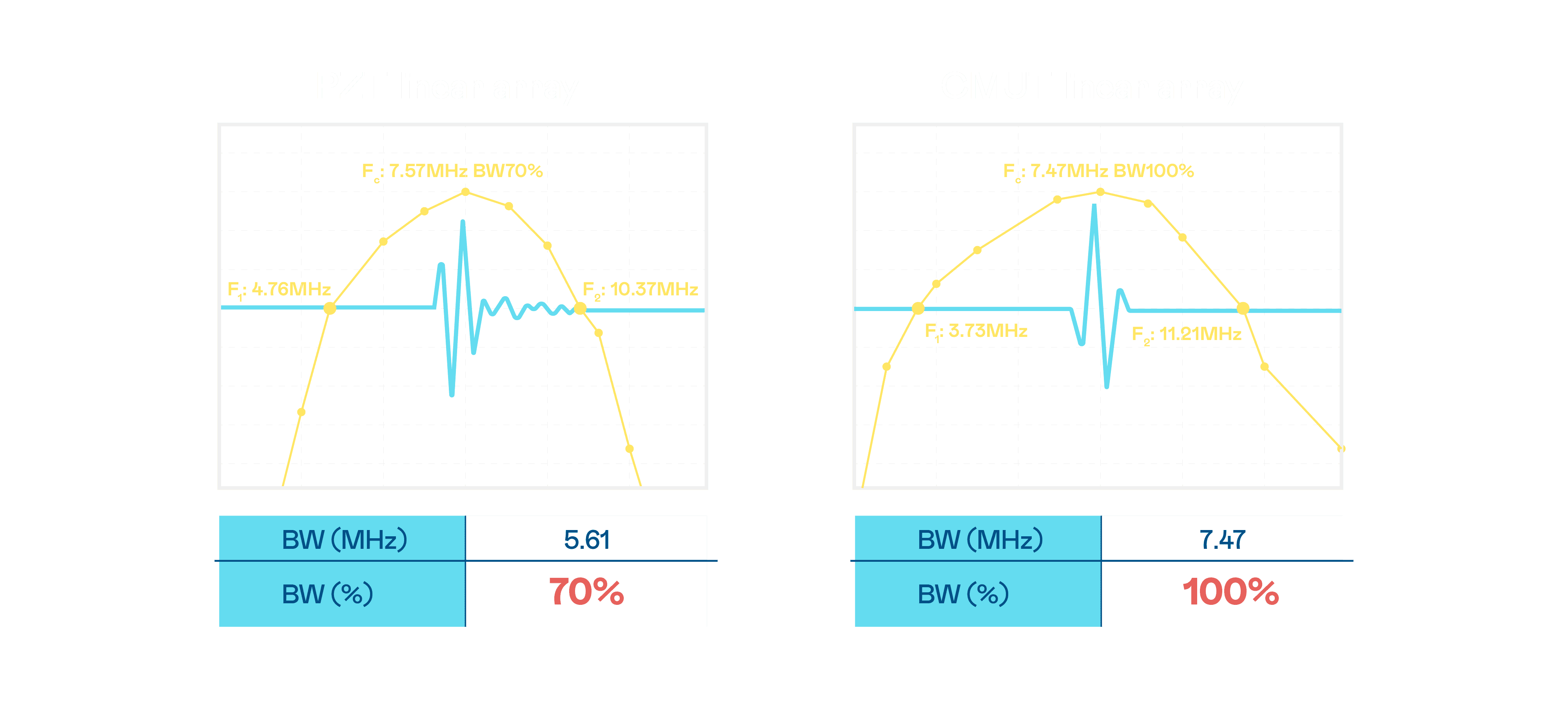 超音波影像的解析度高低,,,,首先取决于探头能发出的讯号频宽。。。。万利 CMUT 可提供高清晰的超音波讯号,,,提供高频宽、、高灵敏度、、、、影像纹理细节更高的超音波影像,,,,协助医护人员缩短影像判读时间及利用精准的医疗影像进行诊断。。